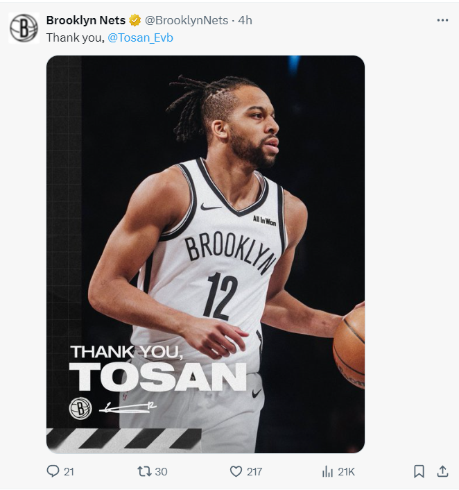 北京时间8月30日,NBA记者迈克尔-斯科特透露,篮网队已经裁掉了双向合同前锋厄沃马的合同,他上赛季在篮网场均23.8分钟,拿到9.5分4.3篮板2助攻。